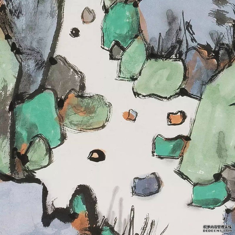 林容生对色彩的运用谨慎而坚定,其筑基于传统金碧青绿,又重视用笔用色过程中出现的随机变幻的效果。他强化色块的大小、形态、强弱对比,丰富视觉效果。