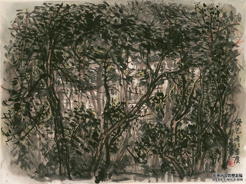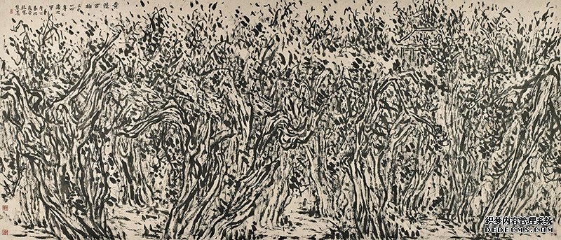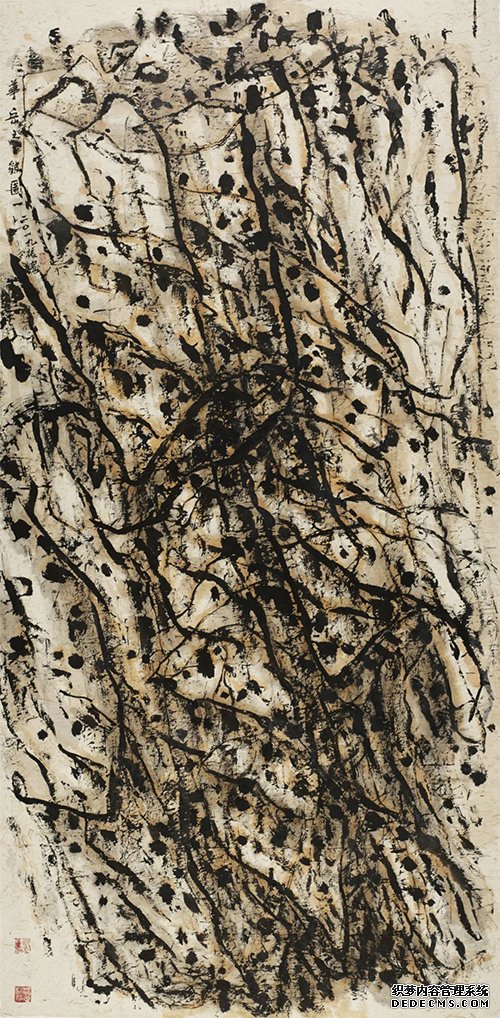 其次,崔振宽特别注重“一波三折”的笔墨力度,在看似“满”“挤”的画面中显现着分明的物象结构,呈现出一种“近观不类物象,远观景物灿然”的艺术效果。他始终坚守着物象造型的绘画理念,但他的物象造型手段既不同于中国传统绘画的意象造型方式,也区别于西方现实主义绘画的形体塑造模式,而是一种源于现代艺术点线语言的绘画技法,同时他坚守着中国画的笔墨质量。也就是说,崔振宽的作品不仅采用书写方式运笔,而且将焦墨的使用达到了极致,尽管在整体上呈现出若隐若现的抽象化造型语言,但在千重万叠之中仍旧顺应着客观世界的自然特征。从中可以看到他对中国传统笔墨做出了具有现代性表现的探索,即是在强调视觉新体验的同时,又包含着值得驻足品味的笔墨意趣和文化内涵。