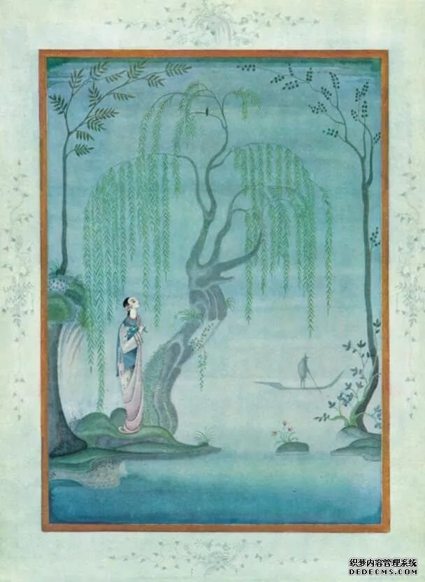 丹麦人最会讲故事,也最会画插画。丹麦插图画家凯·尼尔森(Kay Rasmus Nielsen)是20世纪席卷世界的“插图黄金时代 ”的关键艺术家。1924年,他出版了《安徒生童话绘本》,《夜莺》的故事也在其中。神秘古老又富饶的东方王朝吸引着安徒生也吸引着尼尔森。《夜莺》是一幅很有中国山水画氛围的作品。无论是人物的妆容服饰,还是装饰性的树木,或是远景中的船夫都十分具有东方美学的特征。画面整体呈现一种纤细荒凉的美感。当夜幕降临,真正的夜莺停驻于柳枝之上,美妙的歌声引得树下的女子和船夫都停下来仰头聆听,此时,万籁俱禁,只有夜莺的轻啼余音绕梁,响遏行云。